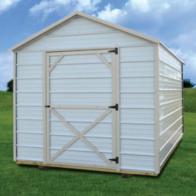 The Utility model features the industry standard gable roof. It is available in 8', 10' and 12' widths (14' & 16' widths available in some areas, based on hauling restrictions). The 8'-wide models features a single metal door (shown), the larger models include a double metal door. Windows are not included.